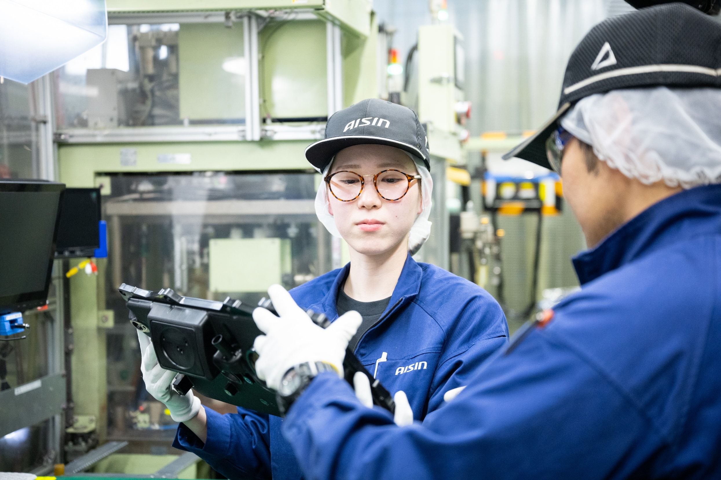 「みんなに近づきたい」学生時代、尊敬できる仲間に囲まれて抱いた思いが、今も彼女の原動力です。アイシンに新卒入社後、樹脂成形課でシリンダーヘッドカバーの組付を担当。人見知りを乗り越え、品質管理検定三級に挑戦し、女性目線での改善提案を行う。成長を続ける彼女が、働きやすい職場づくりへの思いを語ります。