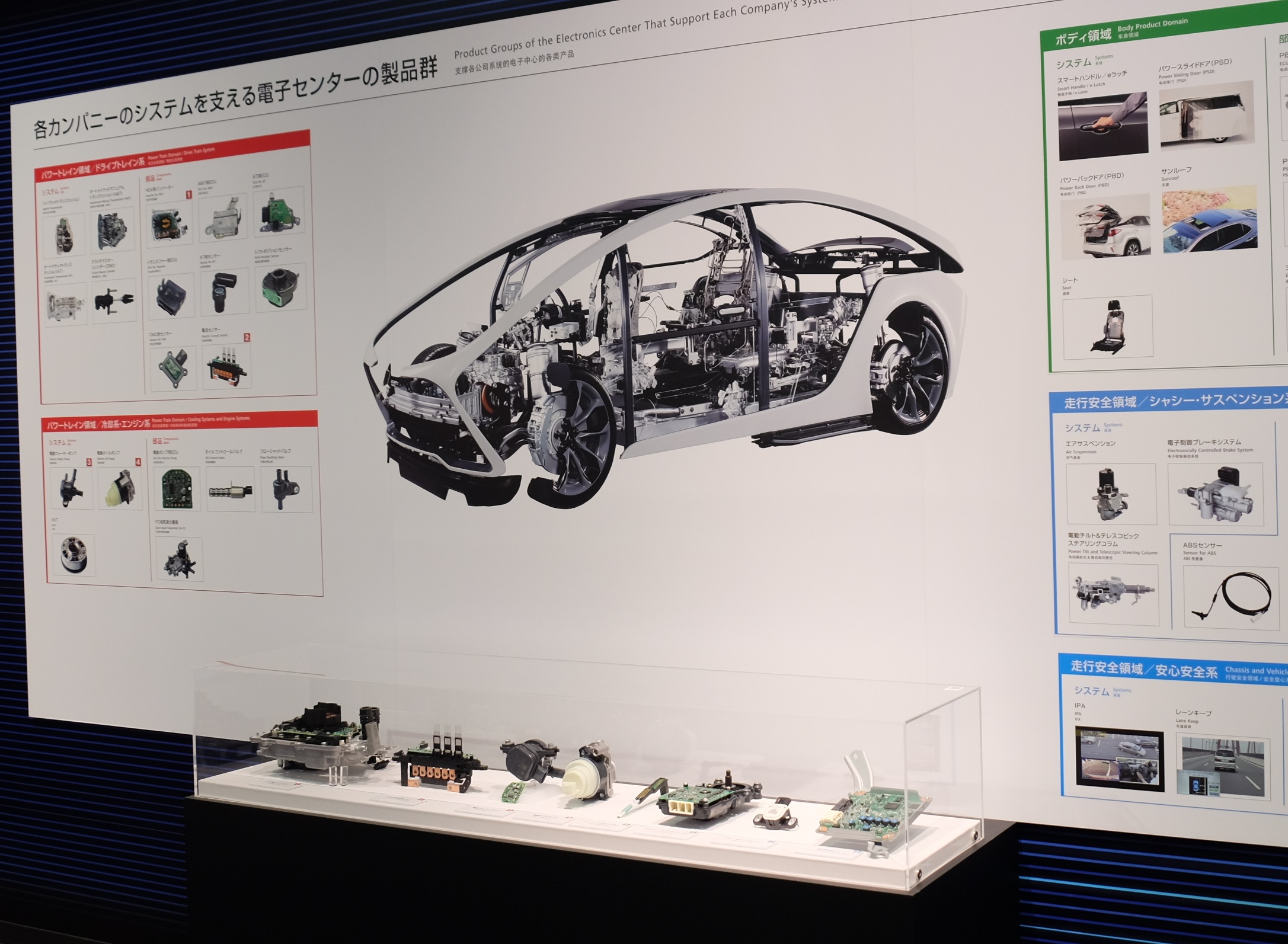 パワートレイン、走行安全、車体など全ての分野において、電子制御システムを支えるECUやセンサーを紹介しています。