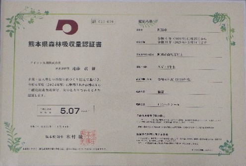 熊本県より、森林吸収量認証書が交付されました