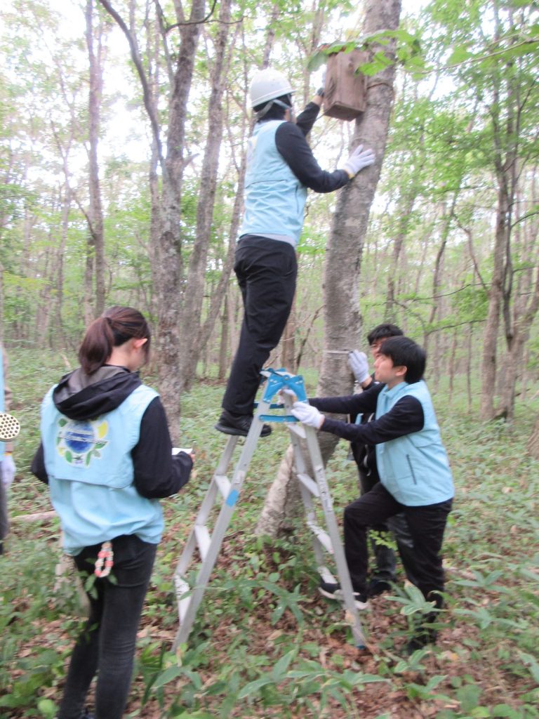 9月19日(金)、北海道苫小牧市のウトナイ湖周辺にて行われた環境コミュニケーション活動に参加し、樹洞を利用する生き物たちのために巣箱と案内看板の作成・設置する活動を行いました。