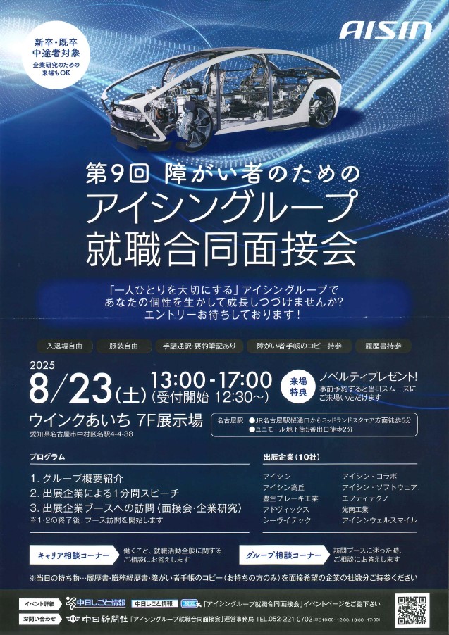 8月25日(土)、中日新聞社様、中日NEXT様のご協力により、ウインクあいちにて「第9回障がい者のためのアイシングループ就職合同面接会」が行われました。