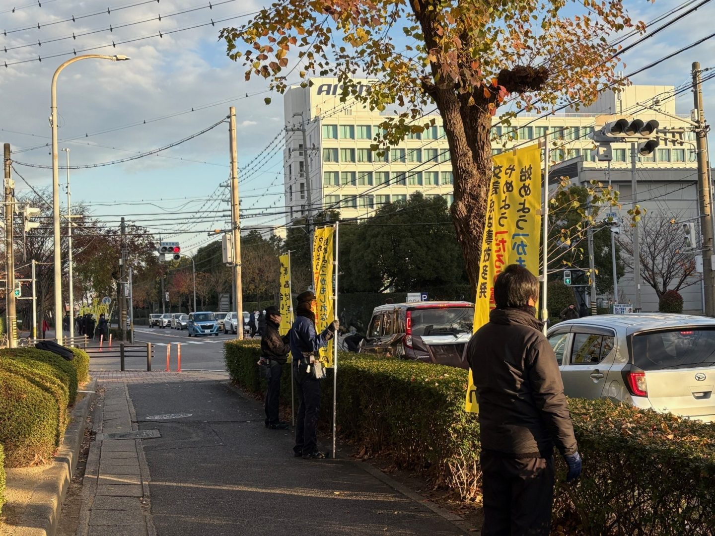 2025年12月5日、アイシン本社前にて交通安全啓蒙活動を行いました。今回の立哨活動には、入社1年目の社員2名が参加し、通行するドライバーの皆さまへ安全運転を呼びかけました。
