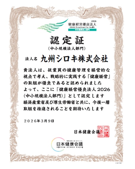 2026.04.08 『健康経営優良法人2026』に認定されました 九州シロキは経済産業省と日本健康会議が共同で進める「健康経営優良法人2026(中小規模法人部門)」に認定されました。 今後も「安全と健康はすべてに優先する」を実践継続し従業員の健康管理の取組を推進していきます。