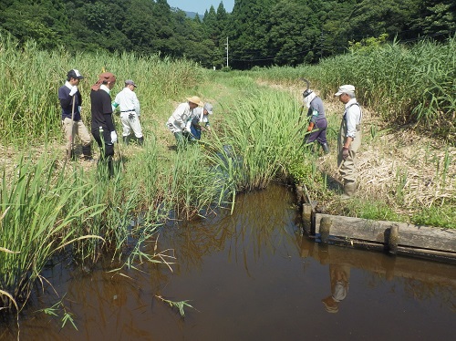 や事業活動とのかかわりを学び考える機会とする」を目的に、炎天下、長さ約50mある水路の水草を掘りました。