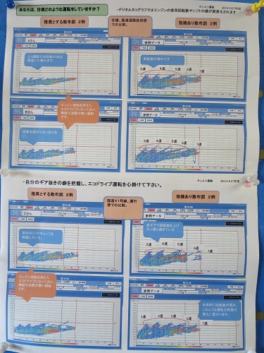 デジタコシステムを活用した教育では帰社ドライバーにデジタコ情報を見せ、実際に自分がどんな運転をしているか確認し、指導することで環境にやさしい運転を身に付ける事を目的としています。