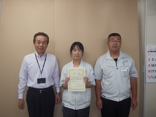 「第32回 富山県フォークリフト運転競技大会」で優勝した林乗務員と3位入賞を果たした江川乗務員の社内表彰を各営業所にて行いました。林乗務員は「女性の部」県代表選手として全国大会に出場します。