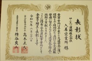 この度、入善営業所が、自動車安全運転センターと富山県警から、1年間の従業員の交通違反や事故の発生が基準以下だったとして「優秀安全運転事業所」の金賞を受賞しました。