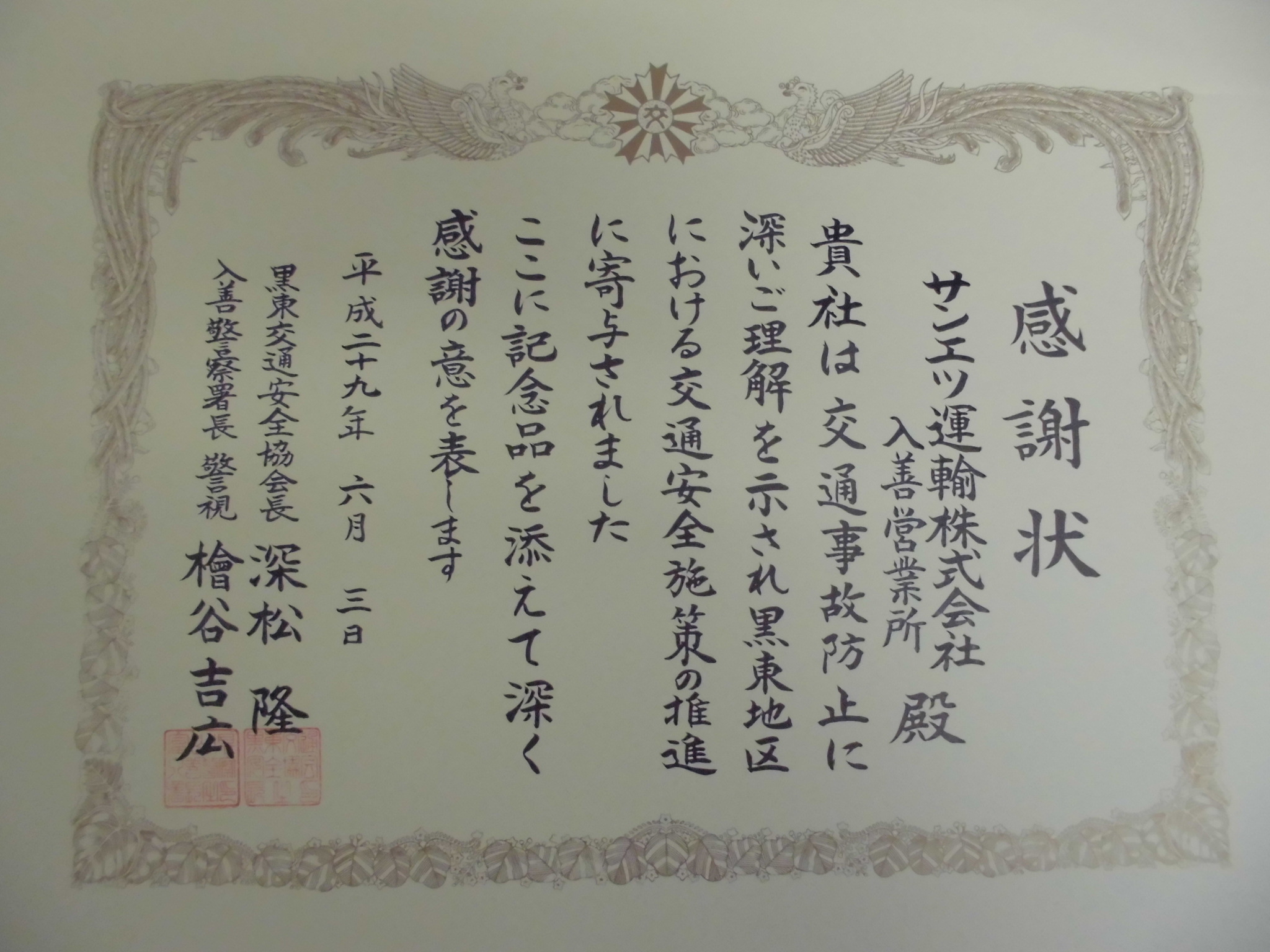 が行われ、入善営業所が交通事故防止に深い理解を示し、地区周辺における交通安全施策の