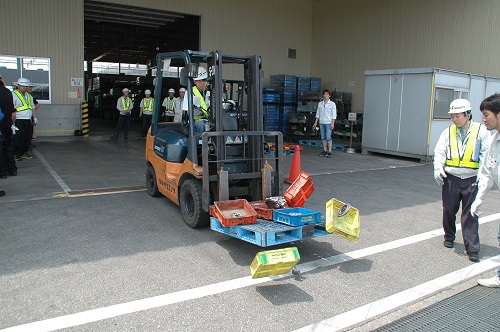 転倒体感訓練では、過去に発生したBパレとポリ箱の「転倒体感訓練」をフォークリフトを使って行いました。