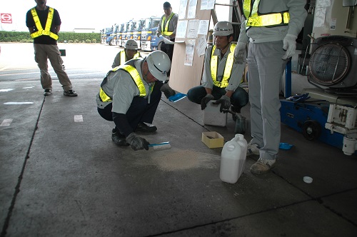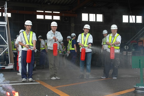 緊急事態対応訓練では「消火訓練ゾーン」と「油漏れ処置ゾーン」にわかれ、消火器を使った消火訓練と油漏れ発生時の対処手順を訓練しました。