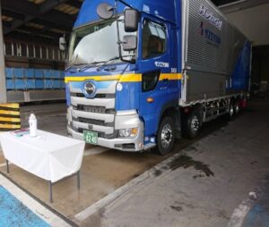 今回導入した車両は、アルミウィング車としては、福井県内初となるハイブリッド大型トラックで、車両総重量は25t、積載重量が13tとなっており、従来のトラックに比べ燃費やCO2排出量が1割以上削減ができる見込みです。
