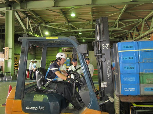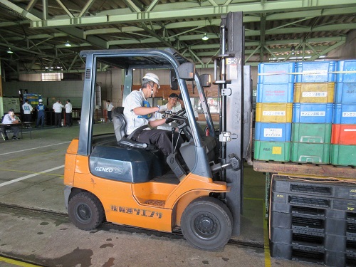 この競技会は、「フォークリフトの安全走行とレバー操作、作業周囲の安全確認、これらの基本手順を再認識し、日頃の手順のズレを修正し安全な作業を習慣づける」ことを目的にしております。