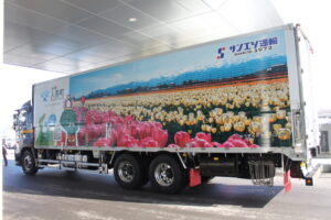 当社は今回で2台目のラッピング車両で、ウィング部分には入善フラワーロードやジャンボスイカ等の特産品がデザインされています。