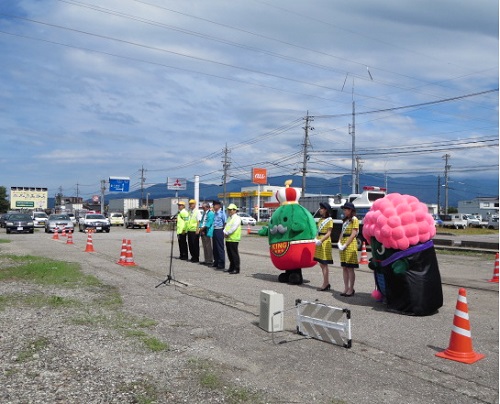7月27日 黒東交通安全協会主催の「入善ジャンボ西瓜でさわやかに夏を走ろう」が入善町椚山地内で行われ、当社従業員4名が参加しました。