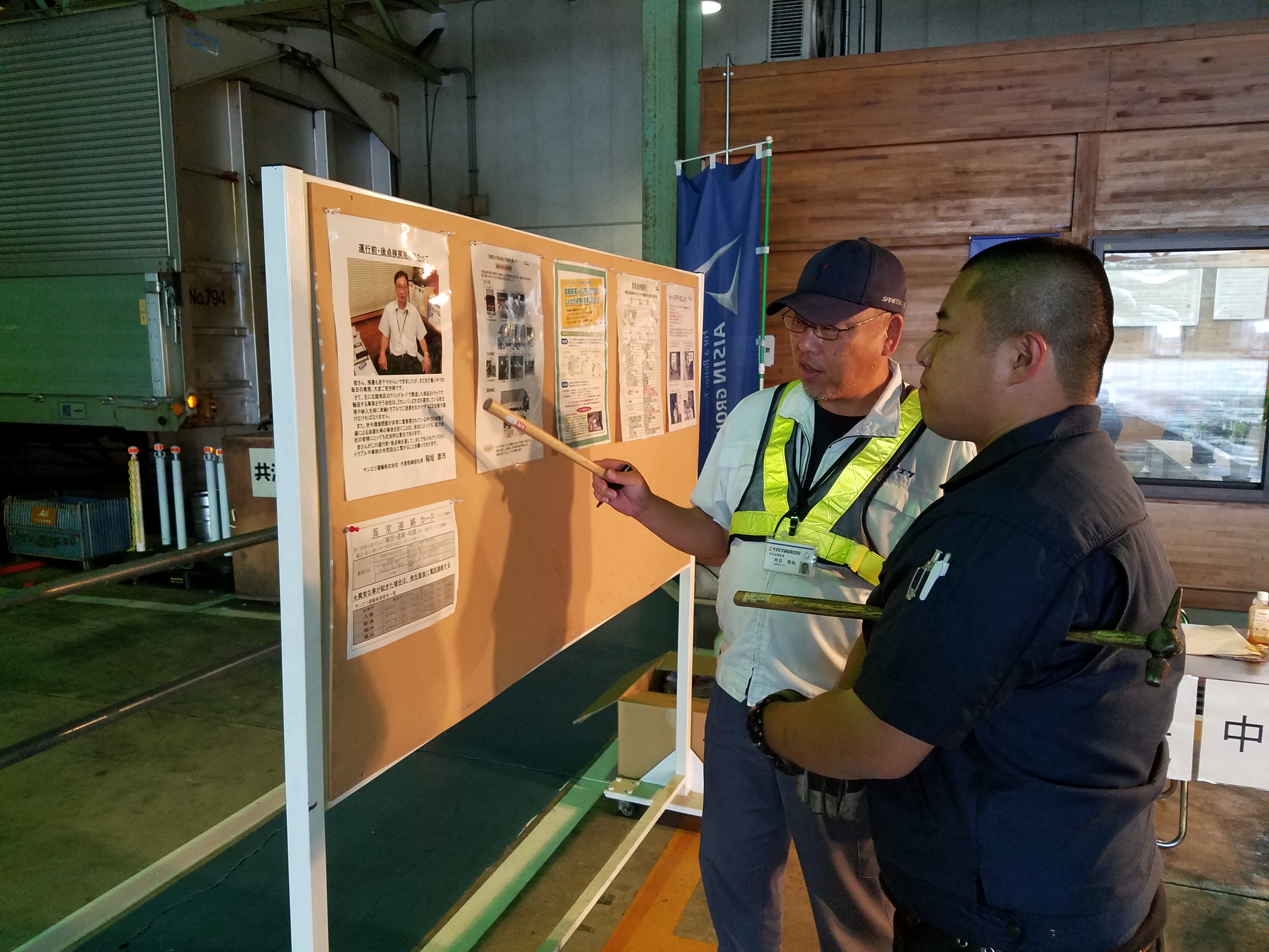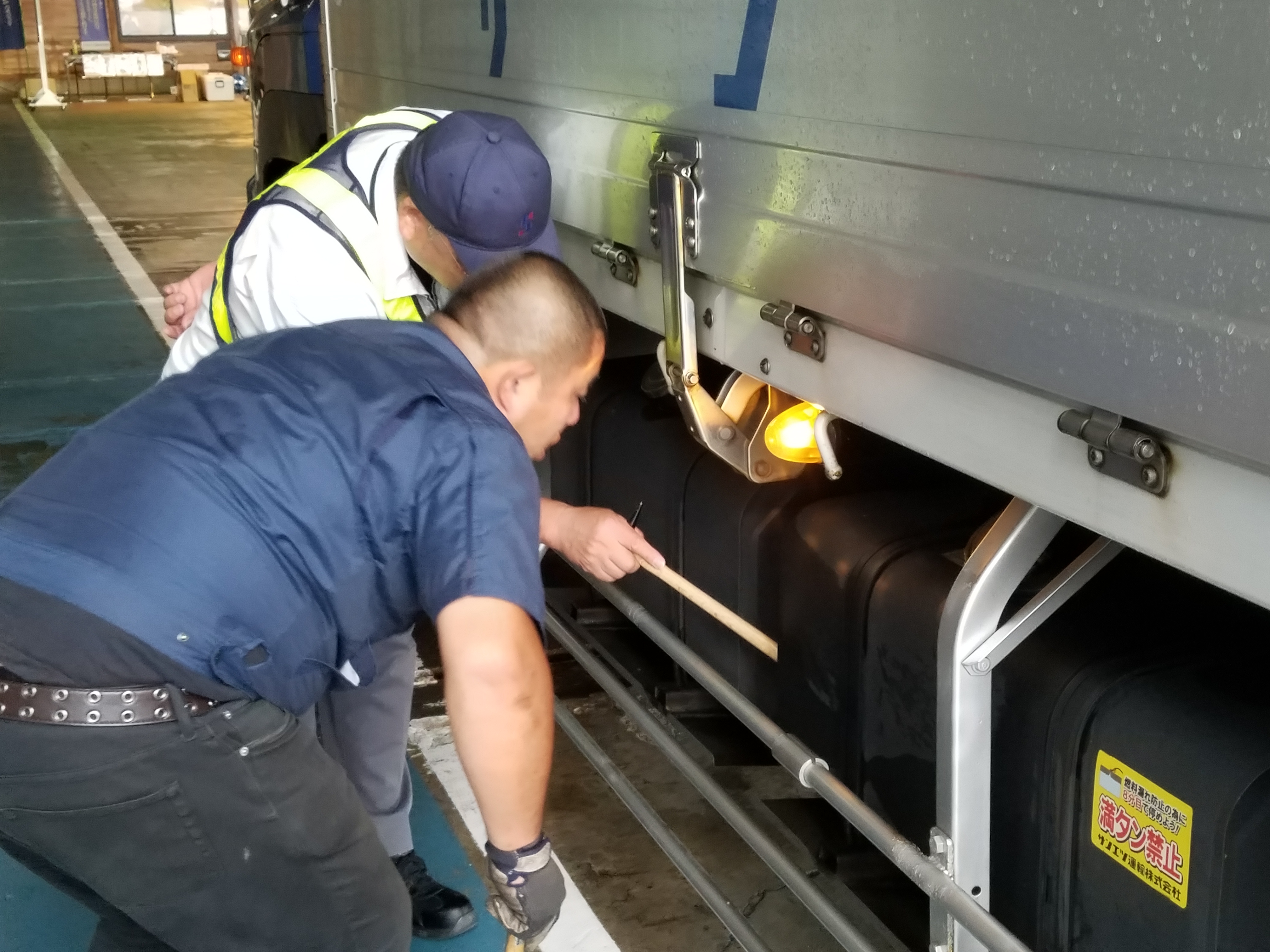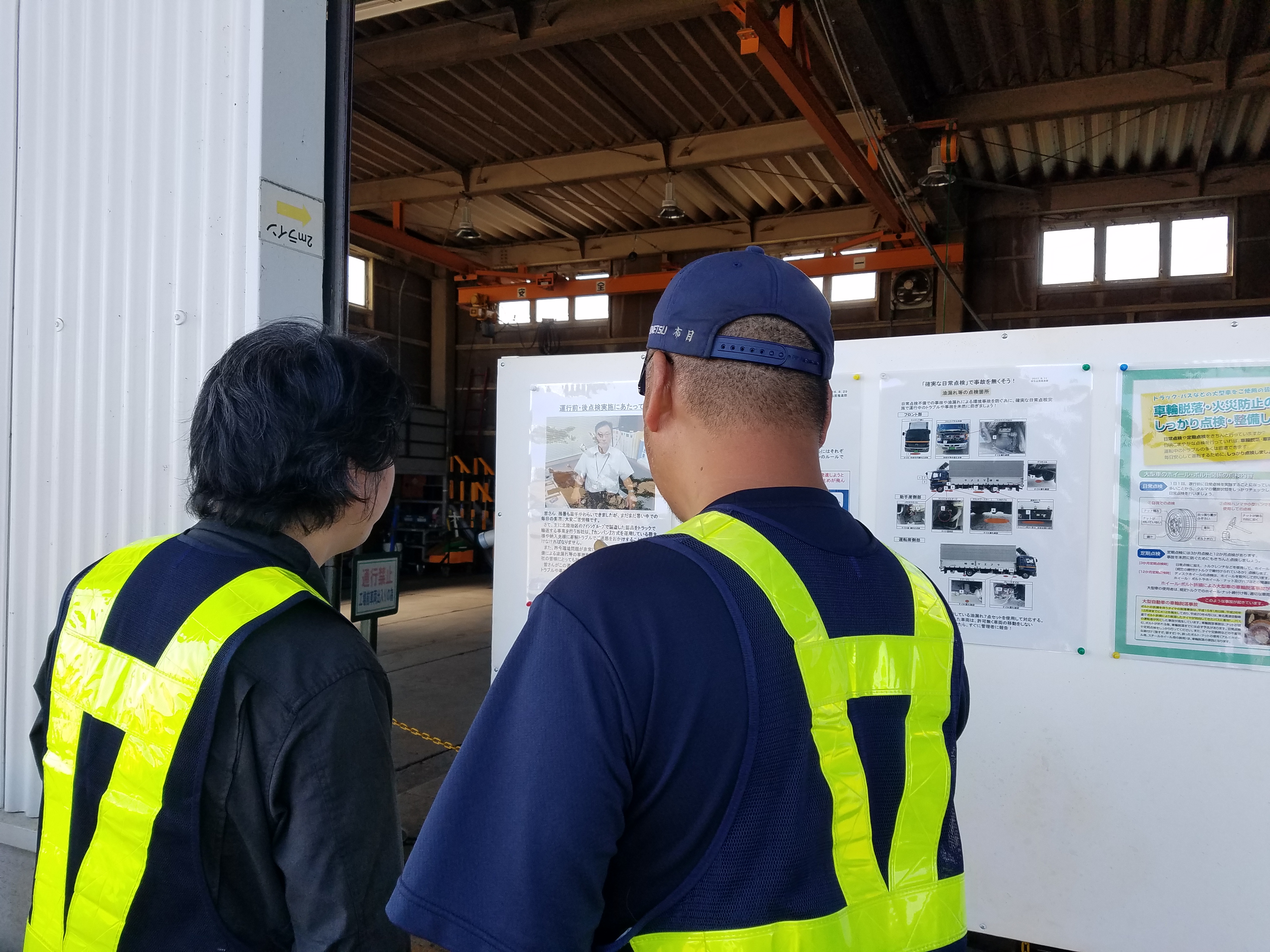 この活動は、運行前・後の車両点検に立ち会い、点検に抜けがなく、確実に行われているか確認し、指導・教育する事を目的としており、今年は