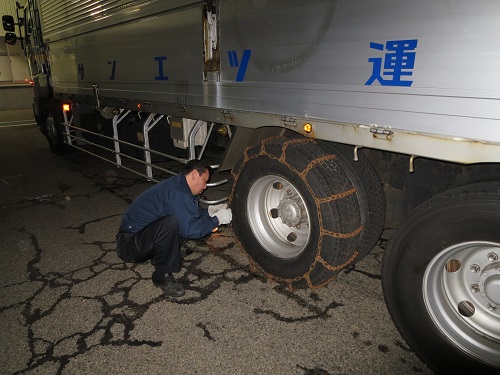 今年から「大雪時のチェーン装着の義務化」が始まりますが、当社ではチェーンを常備させ、冬が近づくと「チェーン講習」を行い安全運行できるよう教育しています。