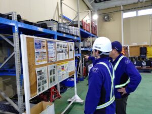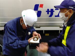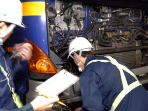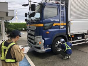 この活動は、日常点検の不備による車両事故や油漏れによる環境事故を未然に防止するために、運行の前及び後に日頃実施している車両点検が正しい判断・基準で行われているかを確認し、問題があればその場で再指導をし、安全な運行を目指すものです。