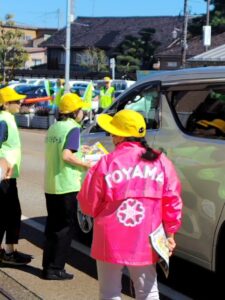 当社は、9月24日(火)に入善町うるおい館前で黒東交通安全協会主催の「シートベルト着用キャンペーン」に従業員4名が参加しました。キャンペーンでは、通行車両のドライバーや同乗者へ交通安全キャンディと秋の全国交通安全運動のチラシを配布し、全座席でのシートベルト着用の徹底を呼びかけました。