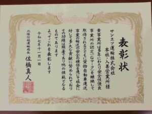 入善営業所「Gマーク長期認定事業所に対する北陸信越運輸局長表彰」を受賞しました。