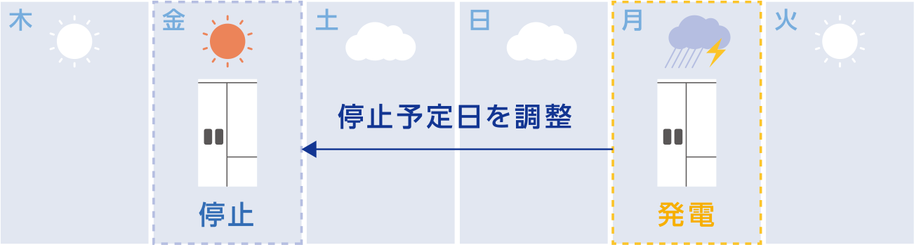 台風による停電が予測される場合に、発電停止日が重ならないよう、自動で発電停止日を調整するサービスです。