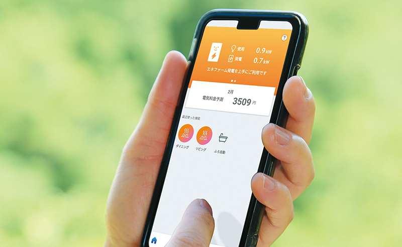 専用アプリ「エネファームアプリⅡ」で外出先からスマートフォンでお湯はりや床暖房のON/OFF、エネルギーの使用状況が確認できます。コミュニケーションツールとしても使えます。