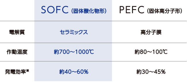 SOFCは、動作温度が高く、電極反応がスムーズなため、低温動作の燃料電池に比べ内部抵抗が低くなります。