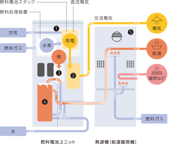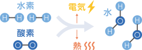 燃料電池は、燃料ガスの成分に含まれる水素と空気中の酸素を利用して、電気と熱をつくります。