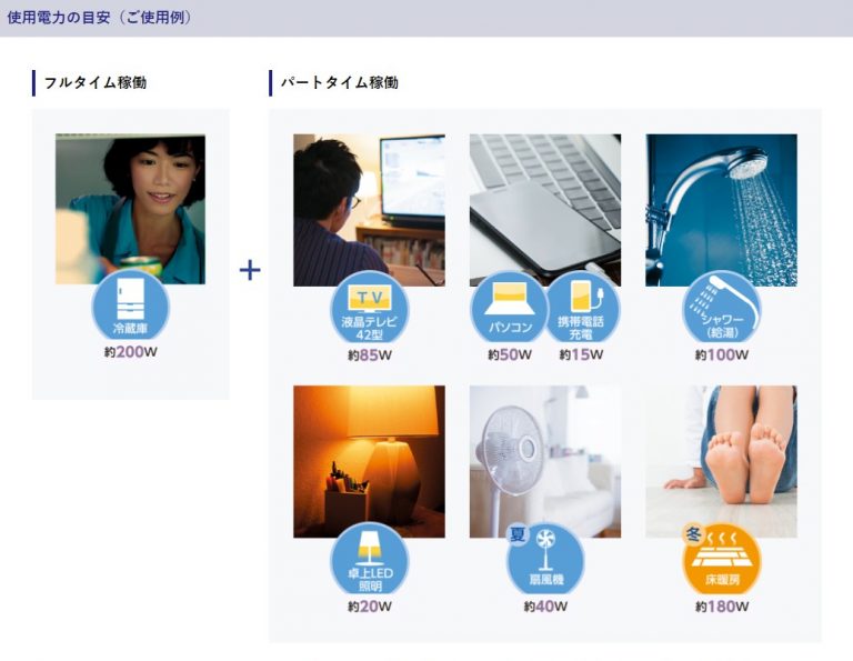 この700Wを使えば、生活家電を初め、携帯電話の充電、照明など、最低限生活に必要な電気を賄うことができます。