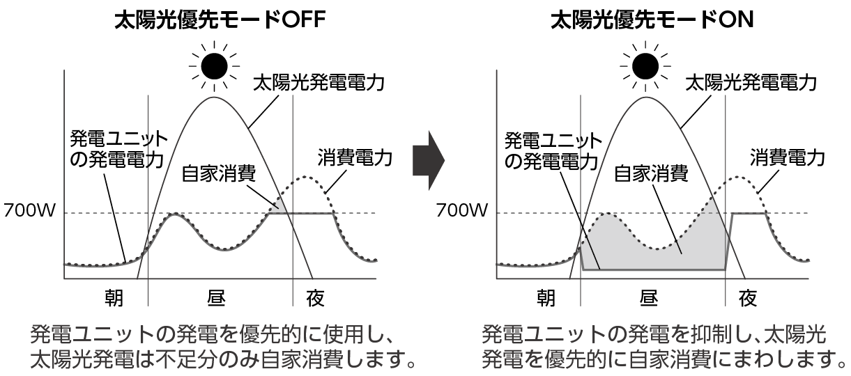太陽光優先モードの設定をすることで、太陽光の発電電力に応じて発電ユニットの発電電力を抑えることができます。