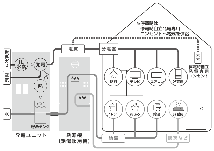 全体構成のイメージ イラストはシステム構成のイメージ図です。(実際の構成とは異なる場合があります)発電ユニットは、燃料ガスから水素を取り出し、その水素と空気中の酸素を反応させて、ご家庭で電気をつくります。発電時に発生する熱はムダにせず、お湯をつくるために利用します。つくられたお湯は貯湯タンクに貯め、給湯時には貯湯タンクのお湯に水を混ぜて熱源機へ送り、リモコンで設定した温度まで加熱します。これにより、快適な給湯やおふろのお湯としてご利用いただけます。