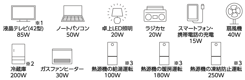 - 数値は定格消費電力の一例です。実際の消費電力は、電気製品の種類や使用方法によって異なります。