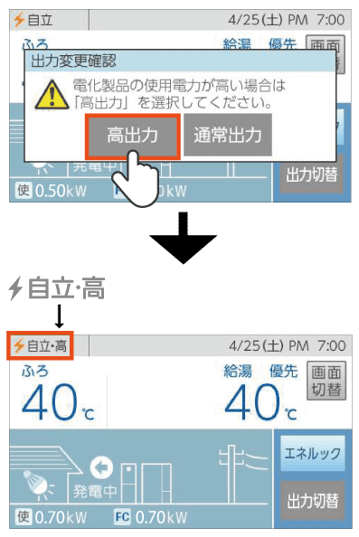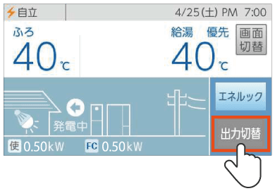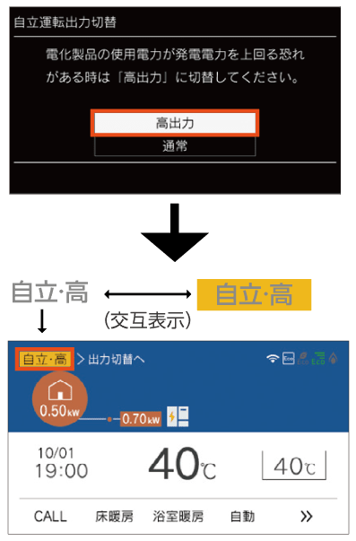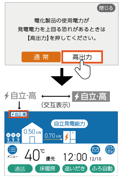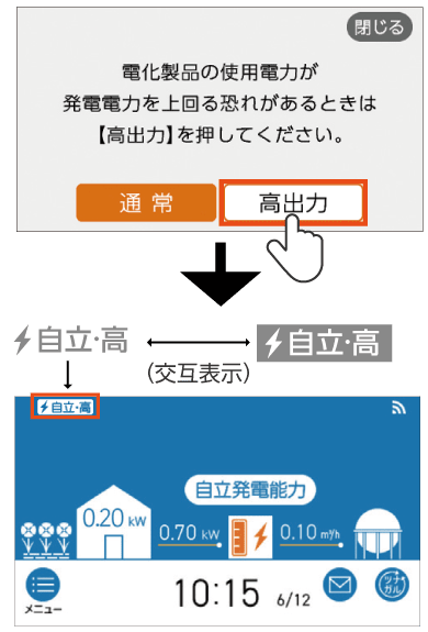 トップ画面左上にある発電状況の文字が[自立・高]に変わります。