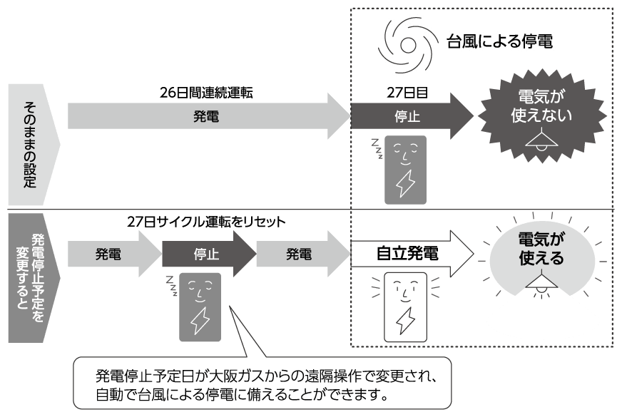 台風などによる停電が予想される場合に、大阪ガスからの遠隔操作にて発電停止予定日を変更し、停電時自立発電をサポートします。