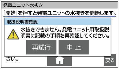 画面に[発電ユニットの水抜き]が表示されている状態であれば水抜きを停止できます。