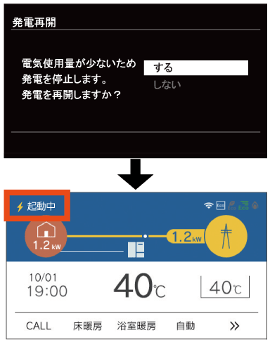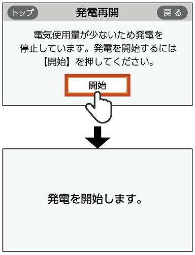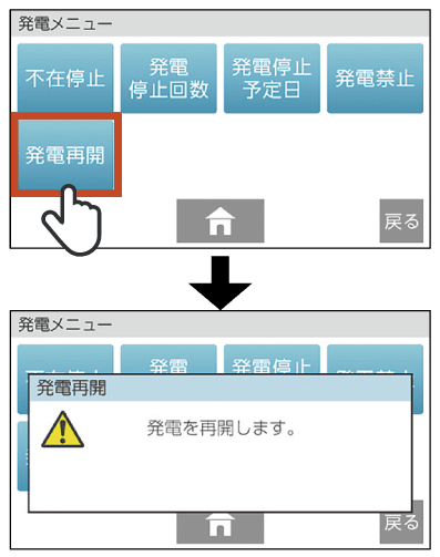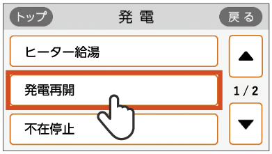 で[発電再開]を選択し、