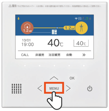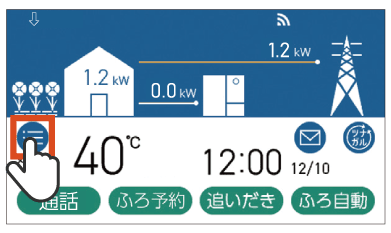 電気使用量が少ない状態が続いて発電が自動停止し、リモコントップ画面に[⇩]が表示されています。