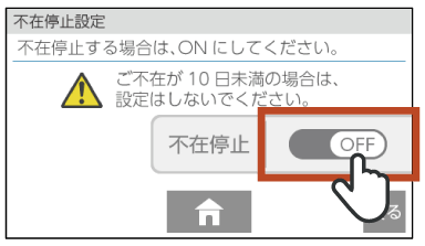 不在停止設定後5時間未満の場合は、上記の手順1から操作を開始し、手順4で[OFF]を選択することで不在停止を解除することもできます。