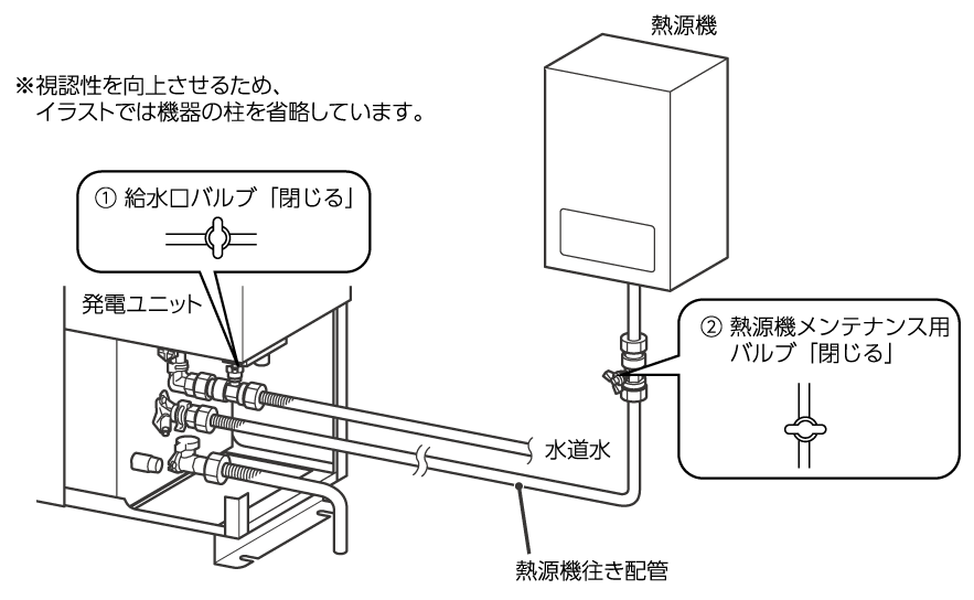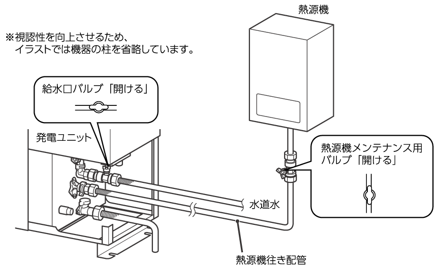発電ユニットの給水口バルブ・熱源機メンテナンス用バルブを開ける