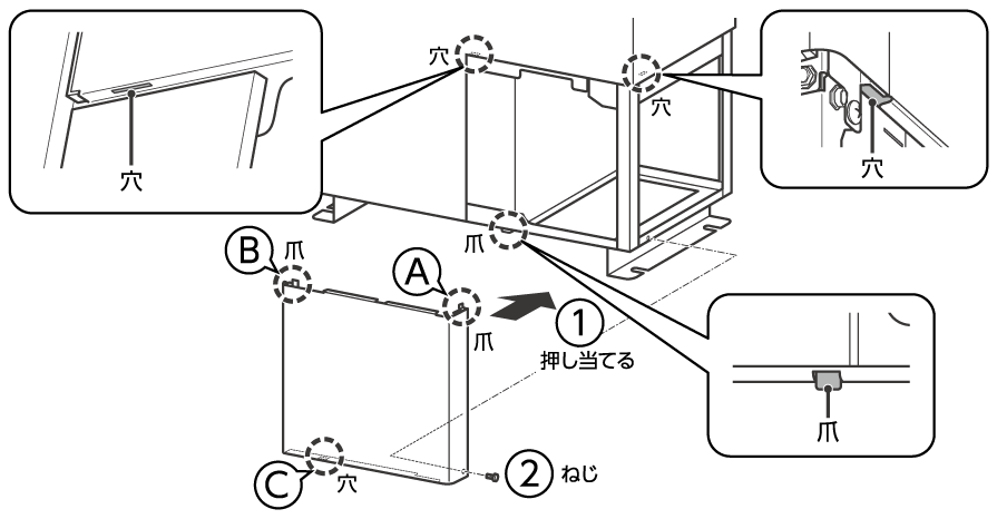 爪(3箇所)がそれぞれの穴に差し込まれていることを確認してください。