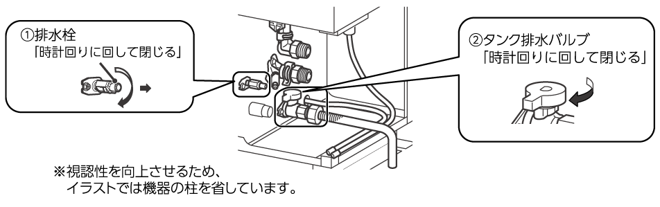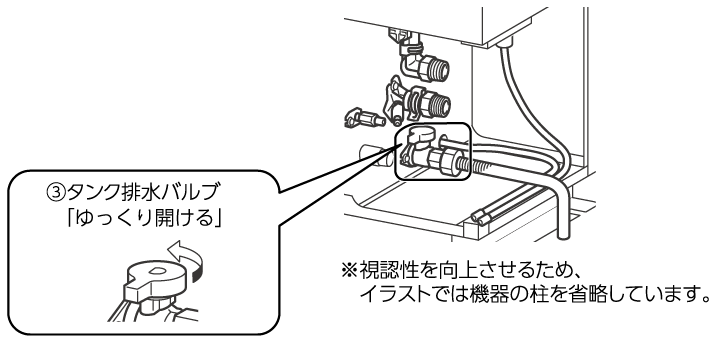 タンク排水バルブに接続された配管から水が出なくなったことを確認したら、下記の操作をする