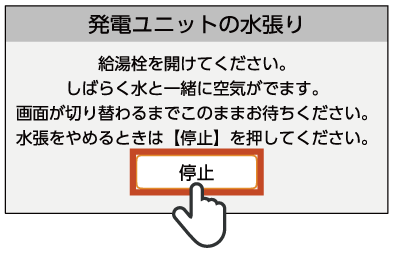 屋内の給湯栓(給湯蛇口)を閉め、[停止]をタッチする