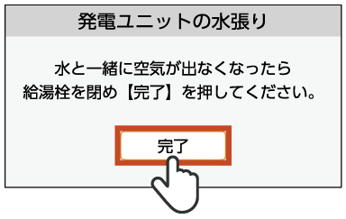 給湯栓から空気が出なくなったら、給湯栓を閉めて[完了]をタッチする