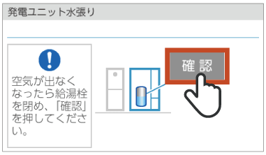 給湯栓から空気が出なくなったら、給湯栓を閉めて[確認]をタッチする