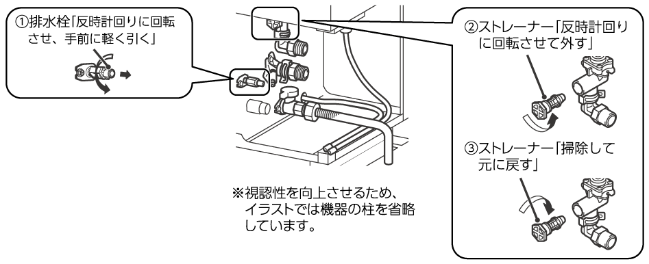 - ストレーナの目詰まりを掃除し、元の場所に取り付ける。