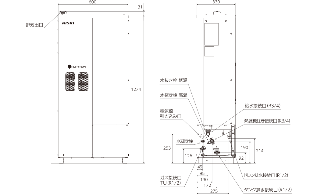 | 外形寸法 | 高さ1,274×幅600×奥行330mm(突起部含まず) | ||